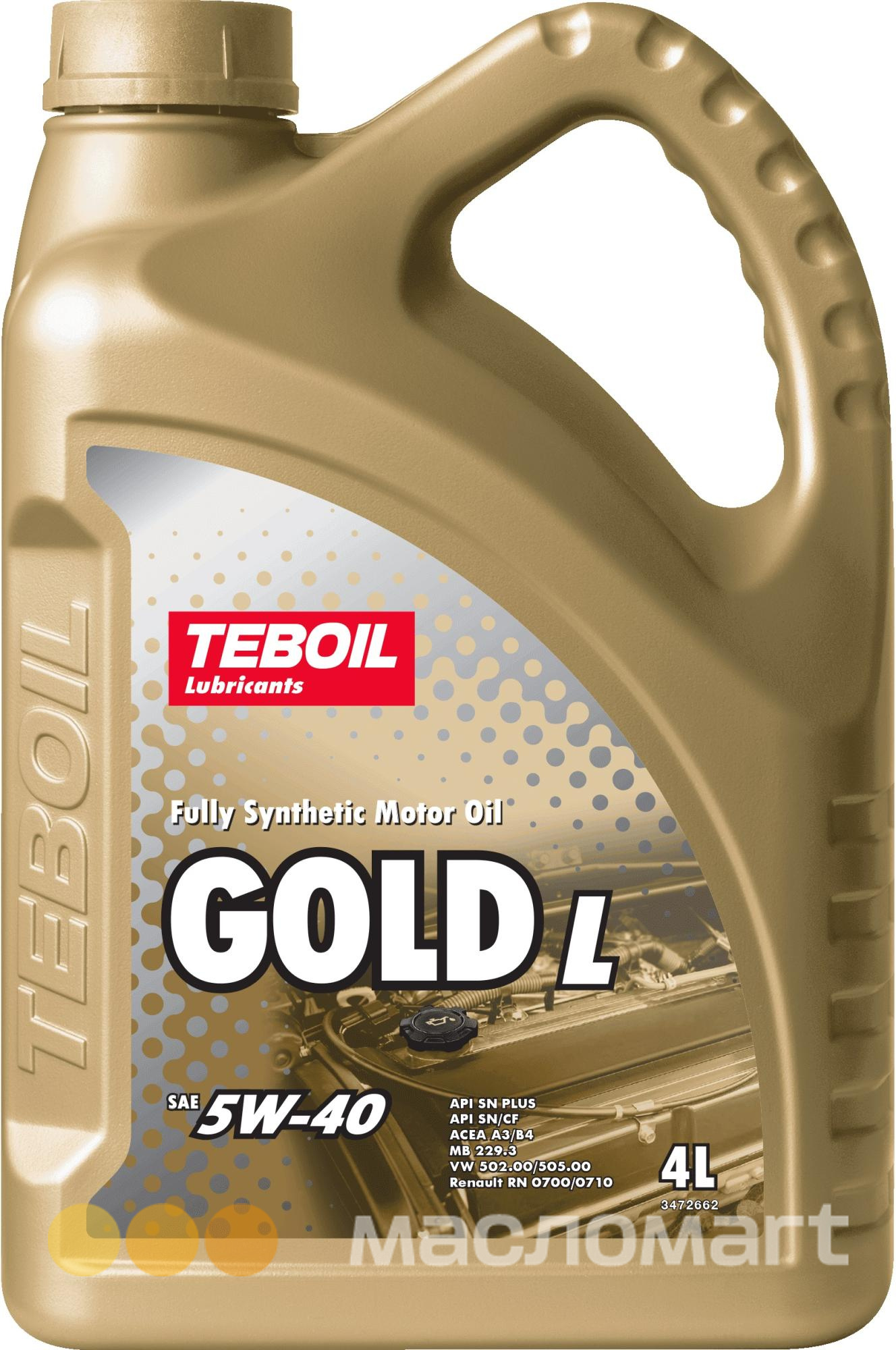 Полностью синтетическое моторное масло для бензиновых и дизельных двигателей, в том числе оборудованных системами турбонаддува и прямого впрыска топлива. Teboil Gold L 5W-40 помогает увеличить срок службы двигателя и обеспечить его защиту от отложений даже в самых тяжелых условиях эксплуатации. Комбинация полностью синтетического базового масла и усиленного пакета присадок адаптируется к разным режимам работы двигателя, усиливая противоизносные и моющие свойства моторного масла. Teboil Gold L 5W-40 защищает бензиновые двигатели современных автомобилей от преждевременного воспламенения топливной смеси на низких оборотах — эффекта LSPI.